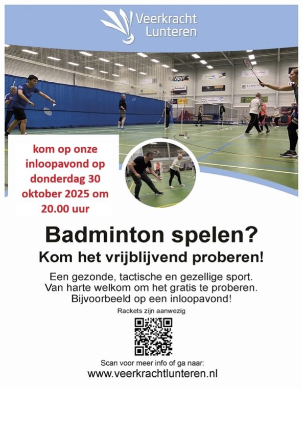 Nu de dagen weer korter worden en het mooie weer het langzaam af laat weten zoek je misschien een alternatief voor buitensporten. Bij badmintonvereniging Veerkracht in Lunteren kun je op recreatief niveau badminton spelen.